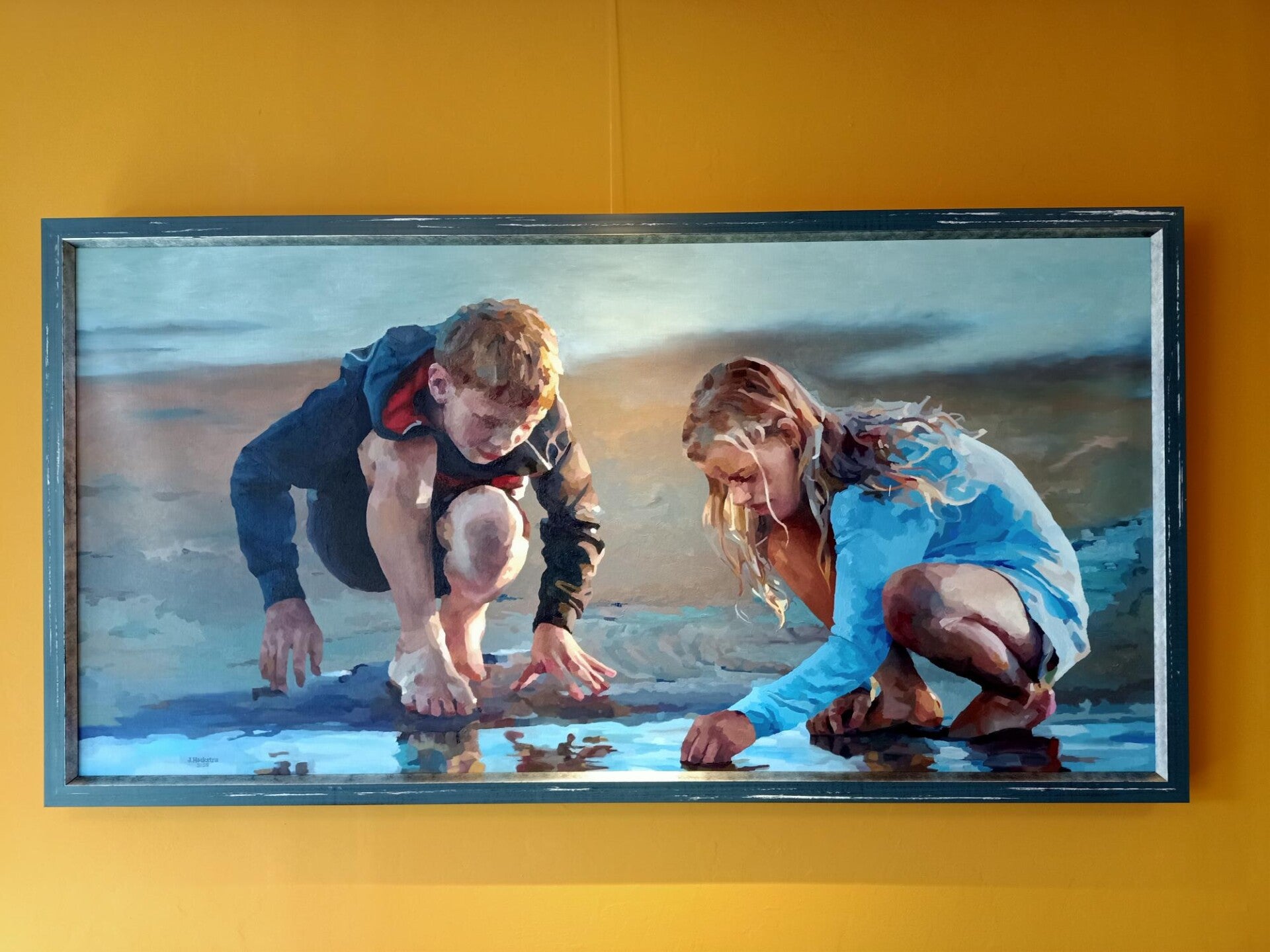Het schilderij van mijn kinderen op het strand dat u hierboven ziet, heb ik onlangs afgemaakt en ingelijst en het hangt nu in de winkel. Het is geschilderd aan de hand van een foto, een aantal jaren geleden gemaakt tijdens een mooie vakantie op Terschelling.