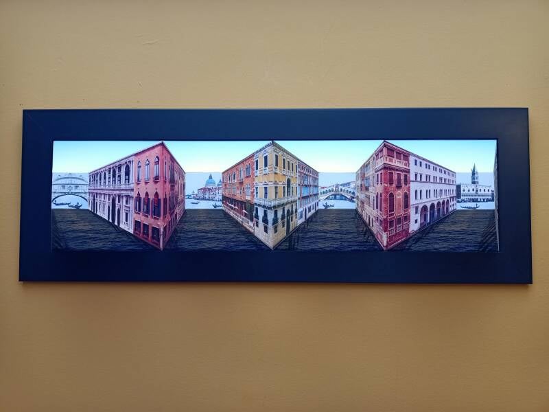 Ik kom in de lijstenmakerij allerlei soorten kunstwerken tegen: schilderijen, borduurwerken, diamond paintings, kleding of posters. Maar zoiets als het werk van deze week had ik nog niet eerder gezien. De torentjes van dit werk zijn zo vorm gegeven, dat er een 3D-effect ontstaat. De hoogste delen van de torentjes verdwijnen juist naar de achtergrond als je er naar kijkt. Het werk komt tot leven als je voor het werk langs beweegt. Heel bijzonder, moeilijk uit te leggen zonder beeld. Hopelijk geven de foto's hierboven duidelijker weer wat ik bedoel.